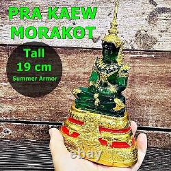 History: The original Emerald Buddha is made of jade and located within the Grand Royal Palace in the Wat Phra Kaew shrine in Thailand. This is a Reproduction of most famoust Sculpture StatueThe Emerald Buddha. Large piece with Heavy Weight. Fine art made with Materials: Clear hard green lucite/plastic or translucent acrylic, highlighted by gold leaf and ruby red rhinestones, with an opaque resin base embellished with more gold leaf details and red enamel.
