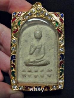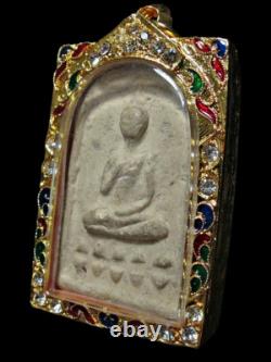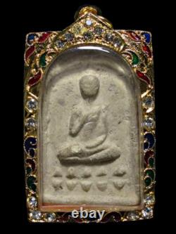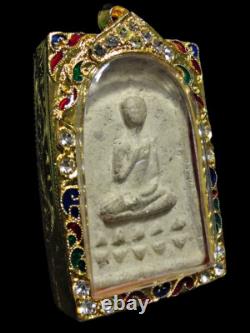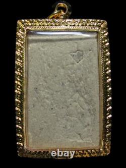 A beautiful Thai amulet features the revered Phra Somdej Buddha Kwak, depicted in the fish teeth style on a lotus base. Crafted and consecrated by magician Buddhist monk LP Kuai for using as mercy, great popularity, bring fortune, safe from various dangers, business prosperous and wealth. This vintage original piece is made from holy mixed materials and showcases a beige color. Its age is year 1972 and its region of origin is Wat Kositaram temple.