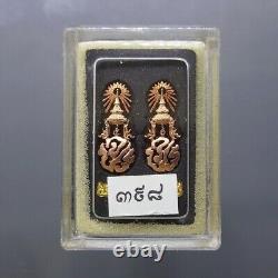 This Thai amulet features a design called Phra Nirantarai Song Kasat, depicting the Great Buddha in black and gold colors. It is made of mixed materials and is an antique original from Southeast Asia, specifically post-1940. The amulet is associated with the Thai Chulalongkorn University Alumni Association and showcases intricate craftsmanship inspired by Buddhist iconography. Thai Amulet Phra Nirantarai Song Kasat Great Buddha Powder Black Gold Dial Royal Initials Two Kings Powerful Invulnerable Safe Danger Occult Merciful Popular Guaranteed.